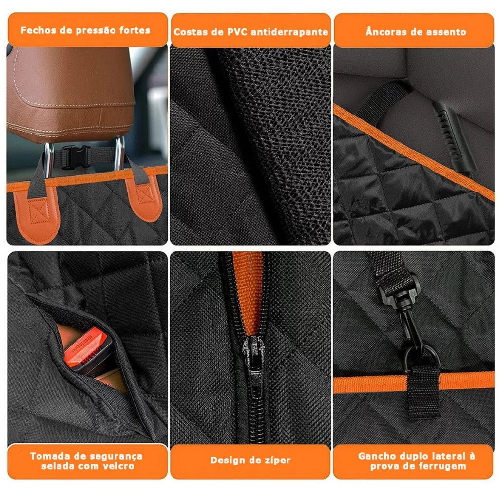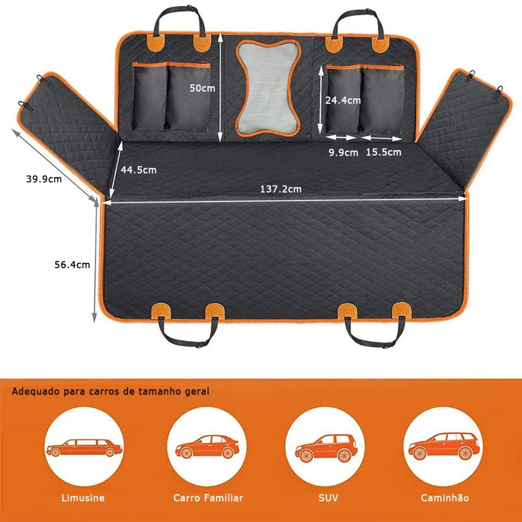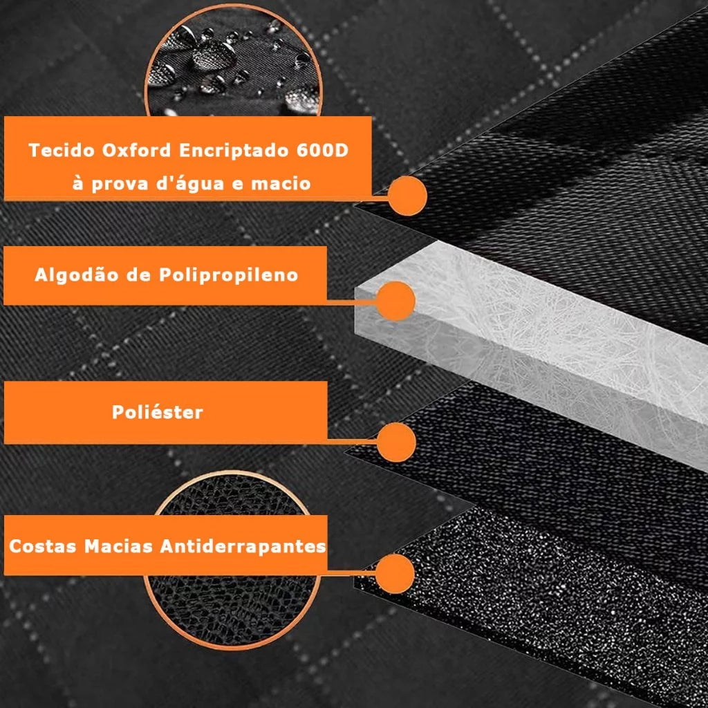 Produzida com tecido Oxford 600D de alta qualidade, a capa é 100% impermeável, antiderrapante e resistente a arranhões. Protege contra pelos, líquidos, lama e odores, mantendo o interior do carro impecável mesmo após os passeios mais animados.